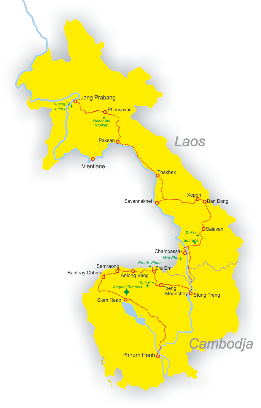 Laos-Cambodja Deze reis brengt je naar de plekken in Laos en Cambodja die met recht op de werelderfgoedlijst van UNESCO staan: de oude stad Luang Prabang, de Vlakte der Kruiken, de tempelruïne van Wat Phu, de unieke Khmer tempels rondom Angkor Wat en het Koh Ker ruïnecomplex. Je mag ze bij een bezoek aan de deze landen niet missen. De reis brengt je ook naar nauwelijks bezochte plekken die je eveneens niet mag missen. Zo volg je in Laos een stuk van de beroemde Ho Chi Minh Trail uit de Vietnam Oorlog, en verblijf je een paar dagen in de onvoorstelbare rust van Champassak. In Cambodja zie je de levendige provincieplaatsen Stung Treng en Tbeng Meanchey. |